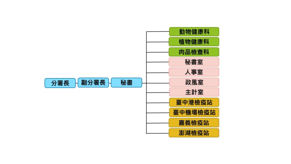 本分署置分署長一人,綜理分署業務,並指揮、監督所屬人員;副分署長一人,襄助分署長處理分署業務;秘書一人,執行幕僚長職責;並設動物健康科、植物健康科、肉品檢查科、秘書室、人事室、政風室、主計室、臺中港檢疫站、臺中機場檢疫站、嘉義檢疫站及澎湖檢疫站等單位。如圖示: