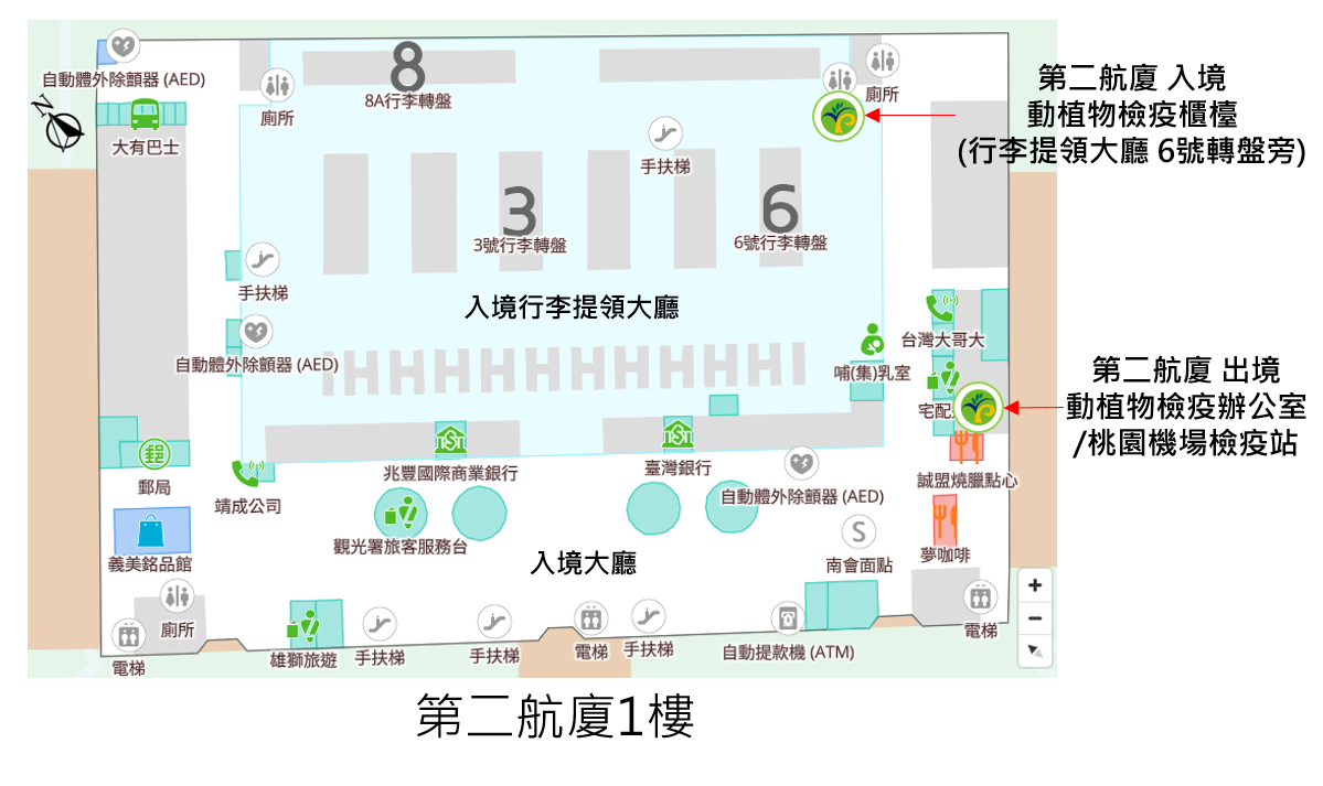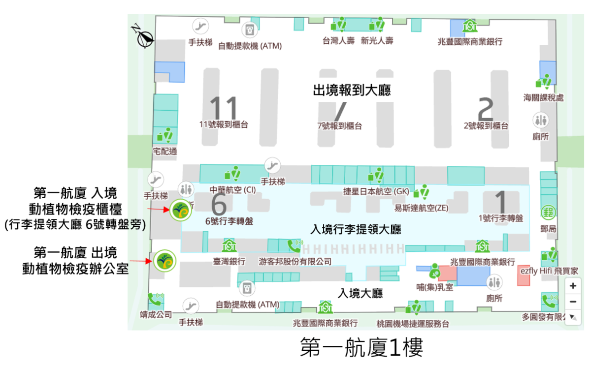 | 辦理桃園國際機場第一航廈旅客出境之動植物及其產品檢疫業務。 | 位置:桃園國際機場第一航廈(一樓入境大廳北側) 電話:(03)3982264 傳真:(03)3834568 |