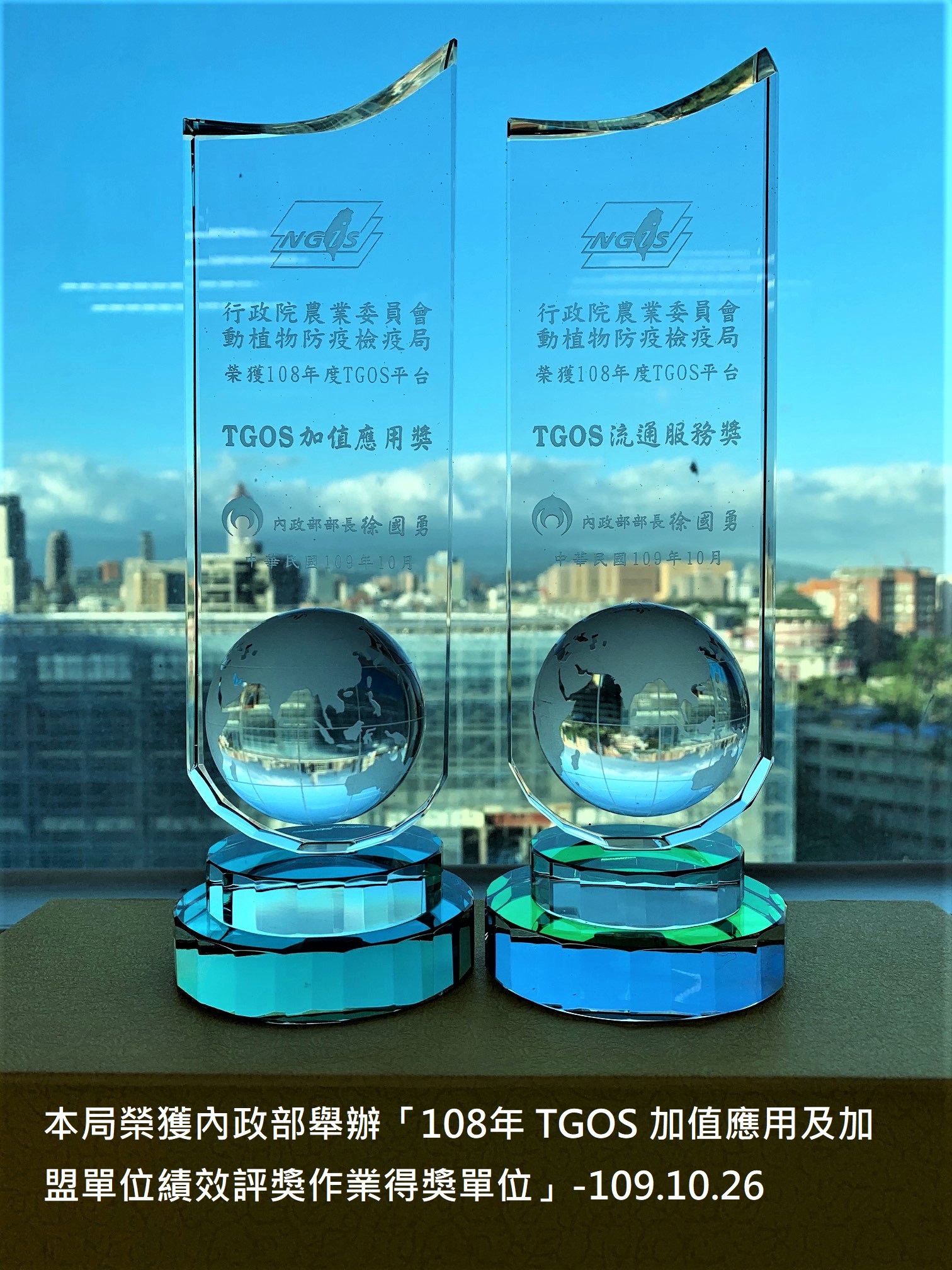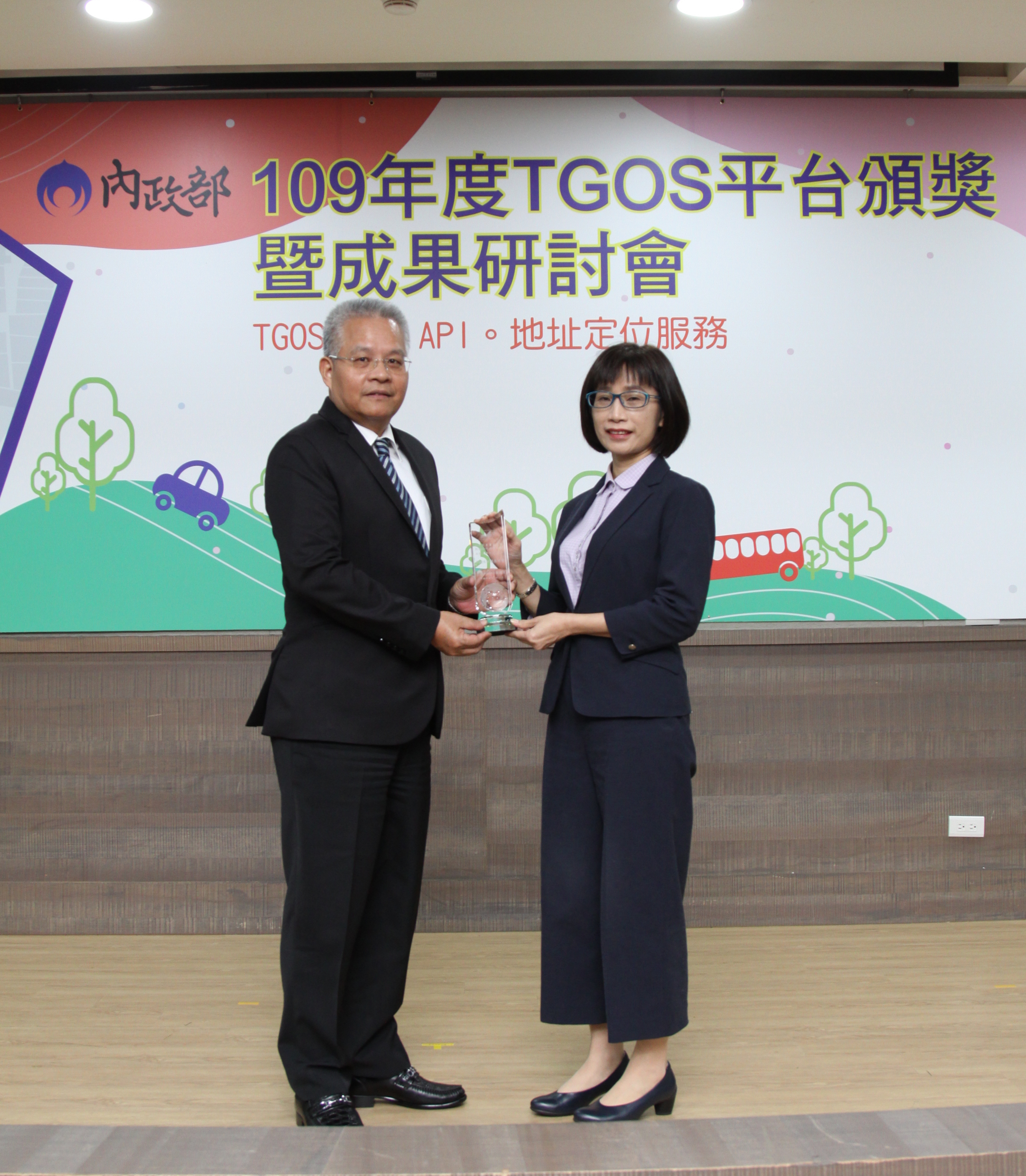 > 本局於109年10月26日榮頒內政部舉辦「108年TGOS加值應用及加盟單位績效評獎作業得獎單位」,由鄒副局長領取「TGOS加值應用獎」及「TGOS流通服務獎」2獎項。