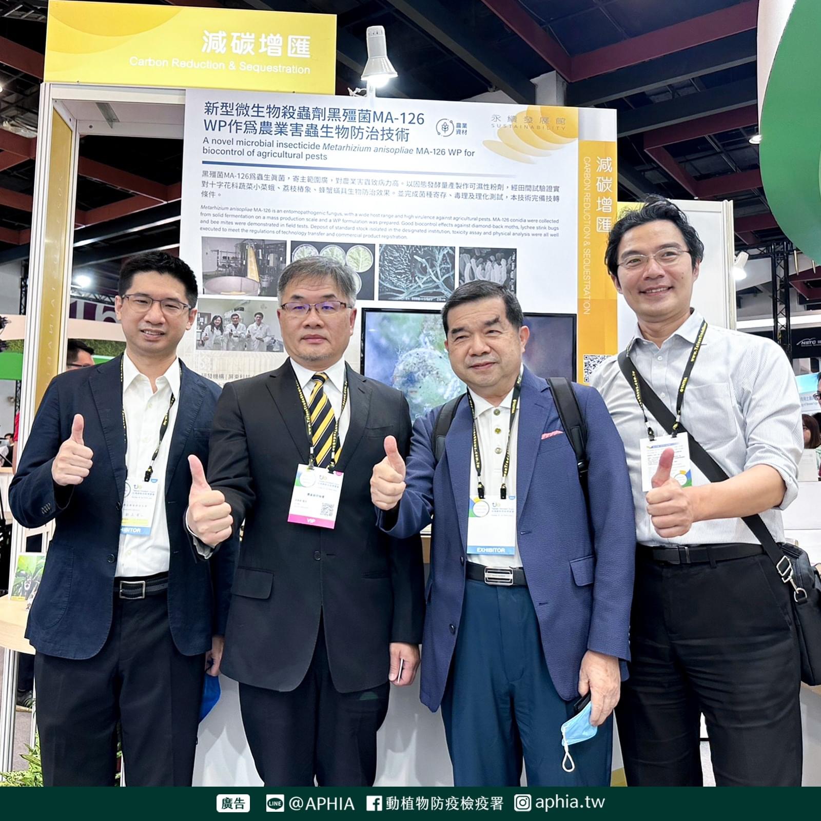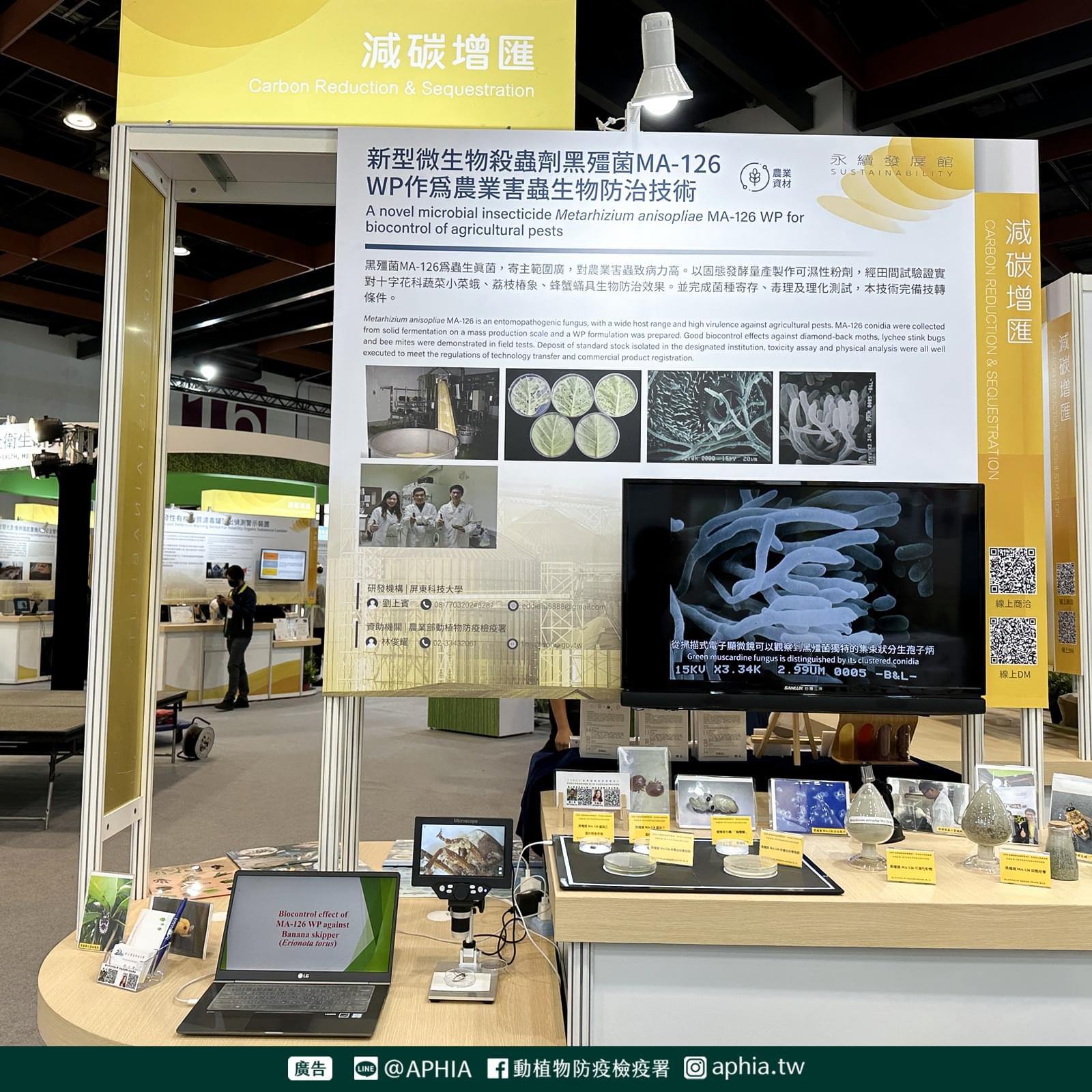 本署及屏東科技大學展出項目為「新型微生物殺蟲劑黑殭菌MA-126 WP作為農業害蟲生物防治技術」,黑殭菌MA-126為蟲生真菌,寄主範圍廣,對農業害蟲致病力高。以固態發酵量產製作可濕性粉劑,經田間試驗證實對十字花科蔬菜小菜蛾、荔枝椿象、蜂蟹蟎具生物防治效果。並完成菌種寄存、毒理及理化測試。展出期間,研究人員均會於現場解說展項特色並與民眾交流互動,歡迎大家前往永續發展館-減碳增匯-SA02參觀。