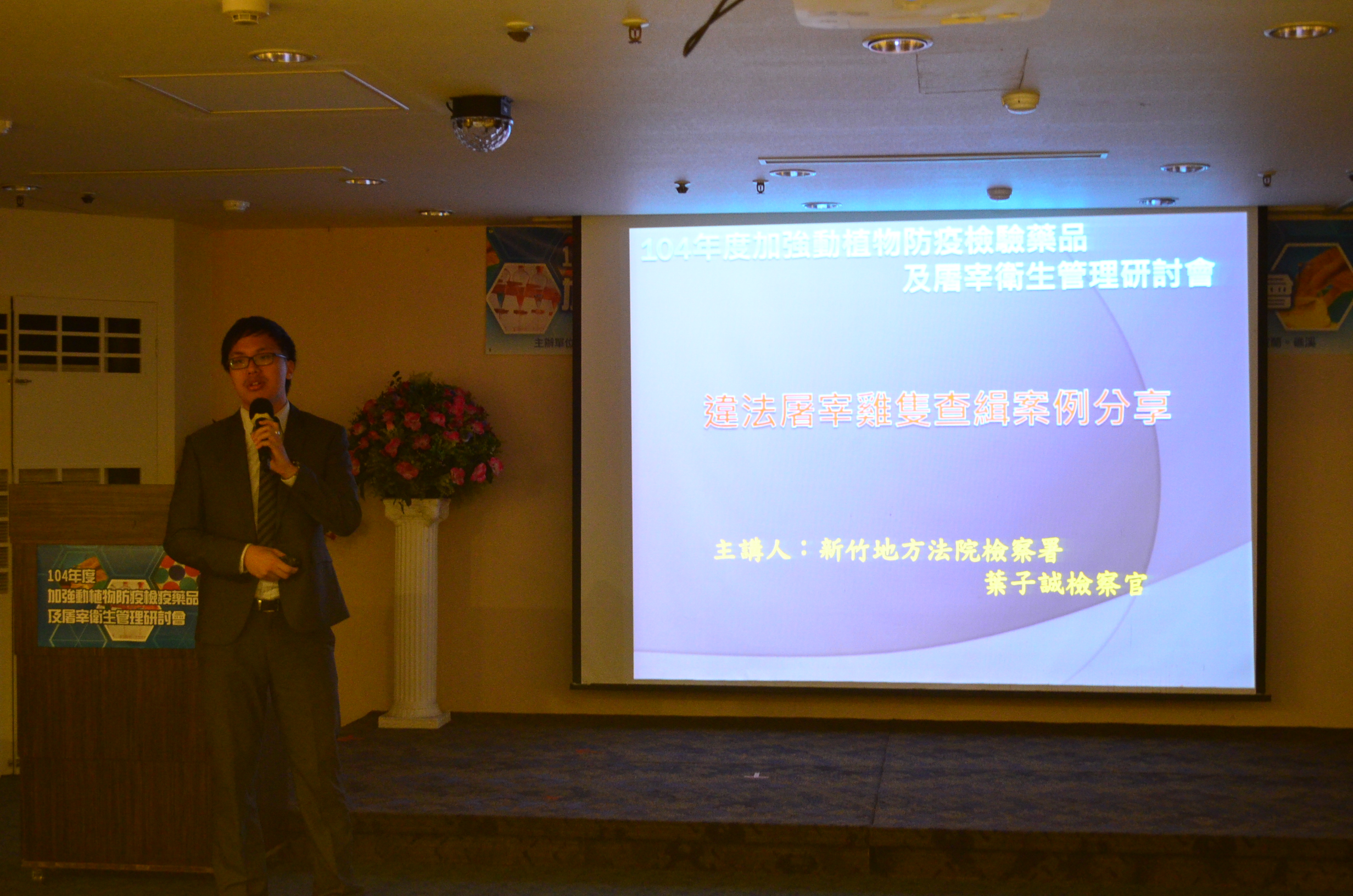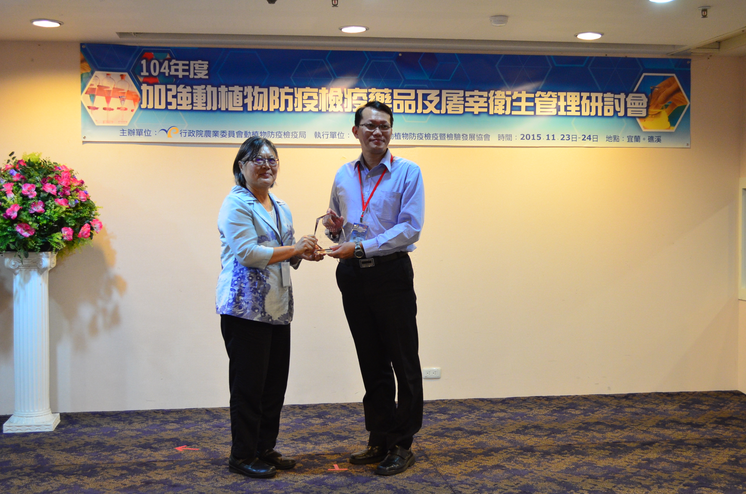 為落實執行動植物防疫檢疫藥品及屠宰衛生管理工作,有效遏阻不法行為,防檢局於104年11月23日至24日邀請各司法檢調相關單位舉開「加強動植物防疫檢疫藥品及屠宰衛生管理研討會」,並於開幕式頒發獎項予協助打擊不法案件協力單位及有功人員。