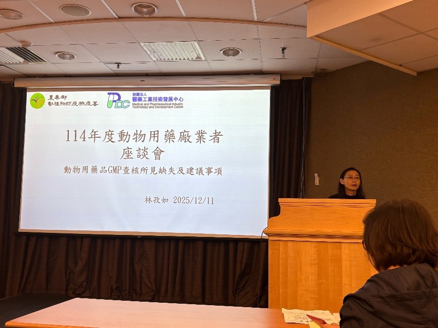 114年12月11日本署於集思台大會議中心舉辦動物用藥廠業者座談會。本座談會邀集動物用藥廠GMP輔導查核人員、主管機關及業界代表共同參與,分享與討論動物用藥廠GMP查核常見缺失與問題。藉由會議交流與溝通,協助業者釐清疑義、提出改善建議,持續精進動物用藥製造品質。為協助國內動物用藥製造廠提升製藥水準並落實GMP相關知能,本署持續依據「動物用藥品製造廠優良藥品製造檢查作業要點」辦理國內動物用藥廠GMP追蹤查核與評級改善工作。透過GMP查核與輔導機制,確保動物用藥廠生產製造及品質管理作業符合GMP相關規定,並協助廠商後續改善,進而提升國內動物用藥品製造品質,達成產業永續經營之目標。