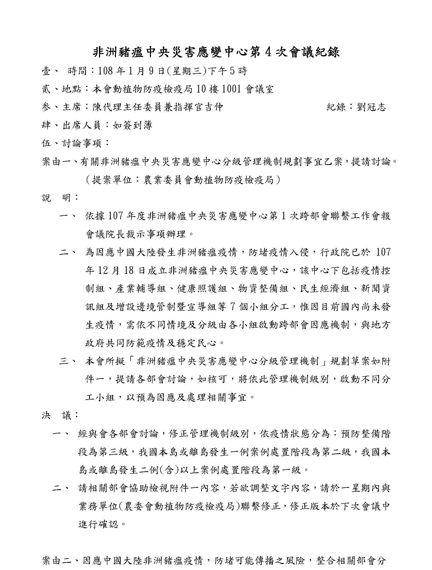 非洲豬瘟中央災害應變中心第4次會議紀錄