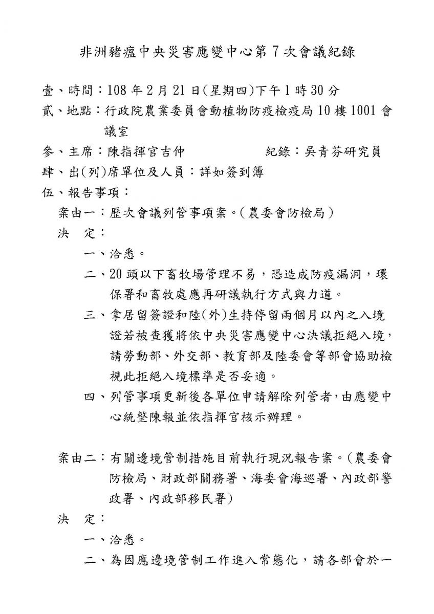 1080221-非洲豬瘟中央災害應變中心第7次會議 逐字稿(pdf)