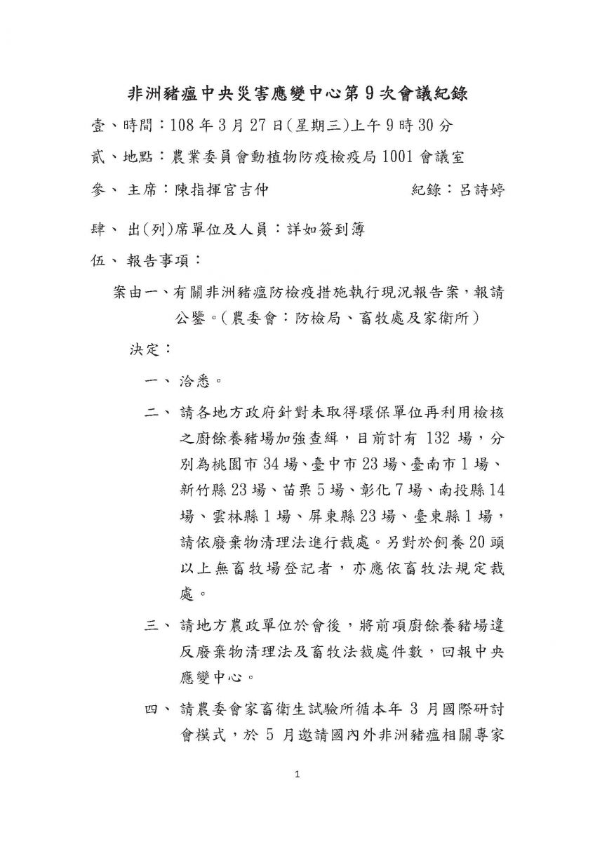 非洲豬瘟中央災害應變中心第9次會議紀錄