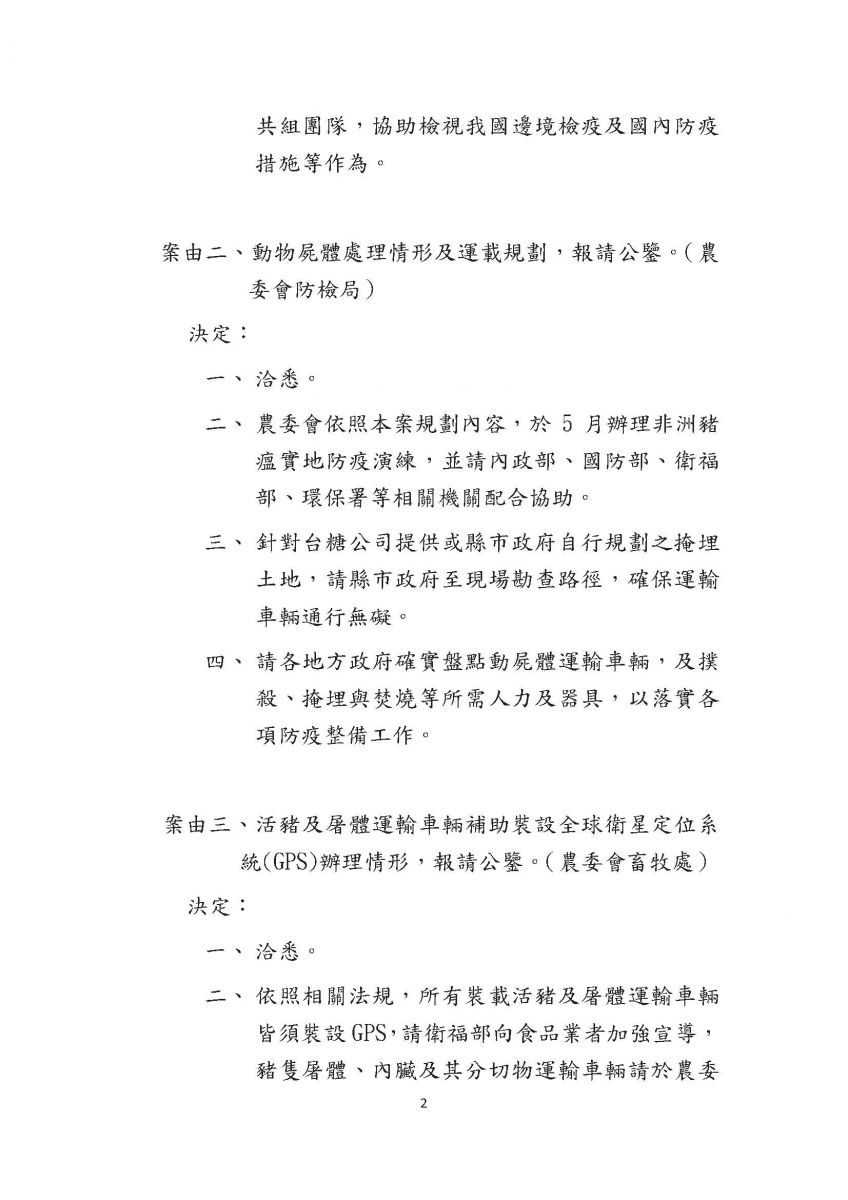 非洲豬瘟中央災害應變中心第2次會議紀錄