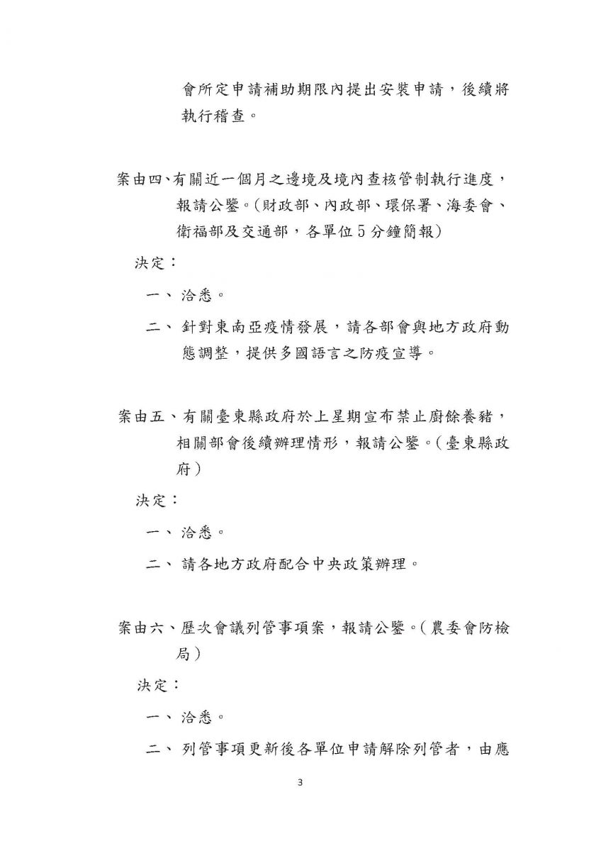 非洲豬瘟中央災害應變中心第3次會議紀錄