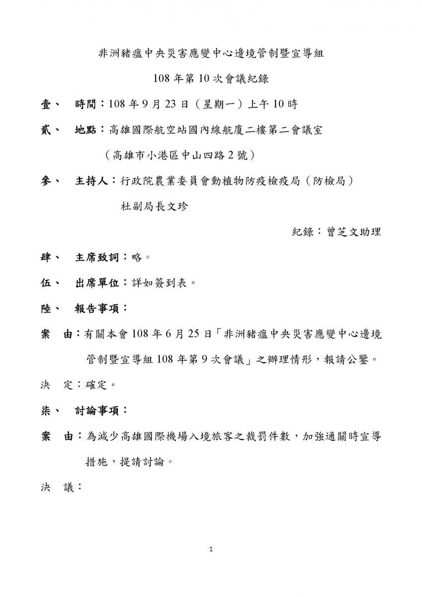 非洲豬瘟中央災害應變中心邊境管制暨宣導組108年第10次會議紀錄