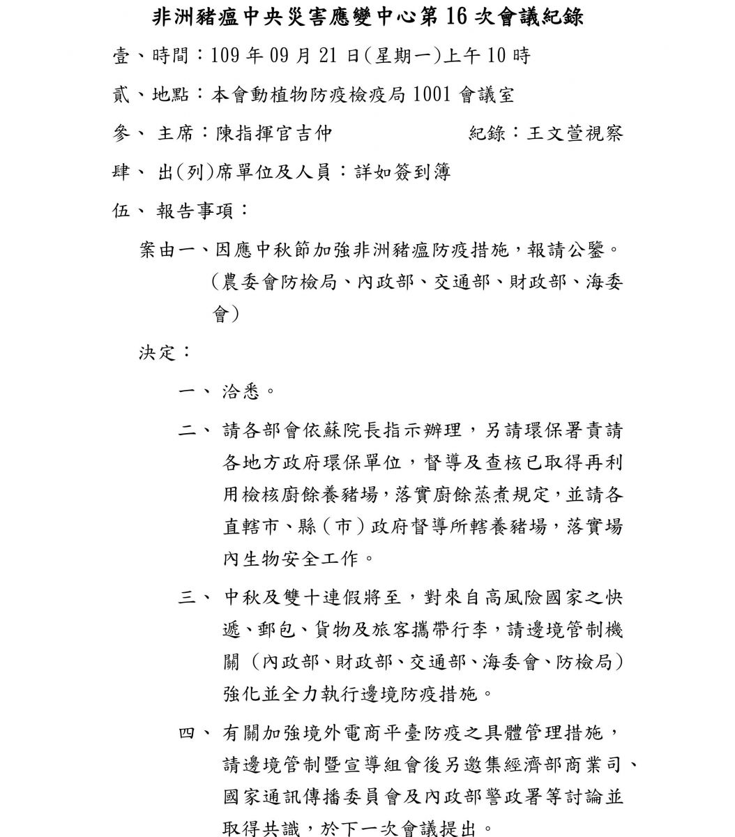 非洲豬瘟中央災害應變中心第16次會議紀錄(PDF)(pdf)