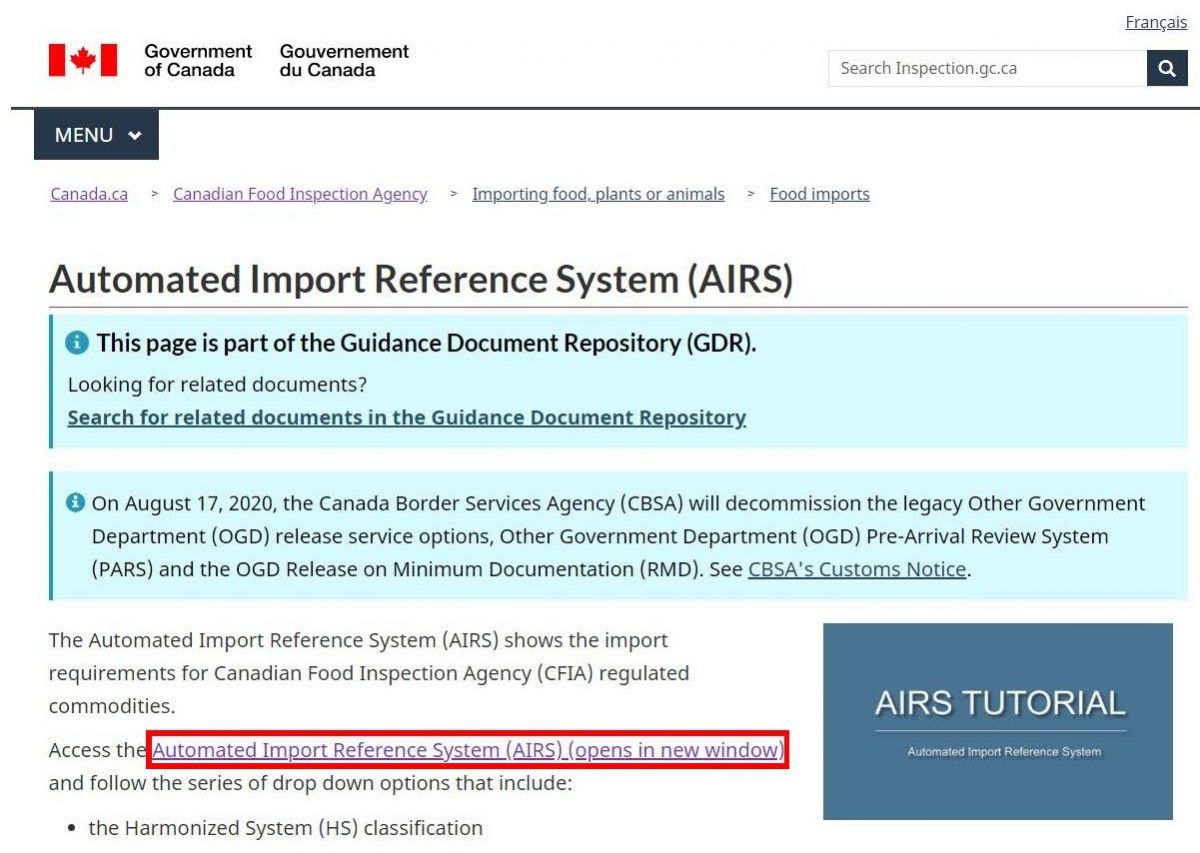 請至加拿大食品檢驗局(CFIA)網站: https://www.inspection.gc.ca/importing-food-plants-or-animals/food-imports/airs/eng/1300127512994/1326599324773#