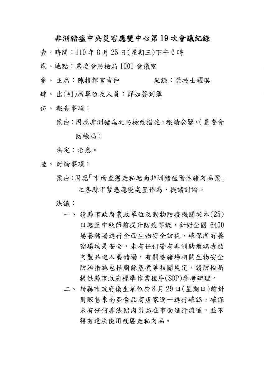 非洲豬瘟中央災害應變中心第19次會議紀錄(PDF)(pdf)