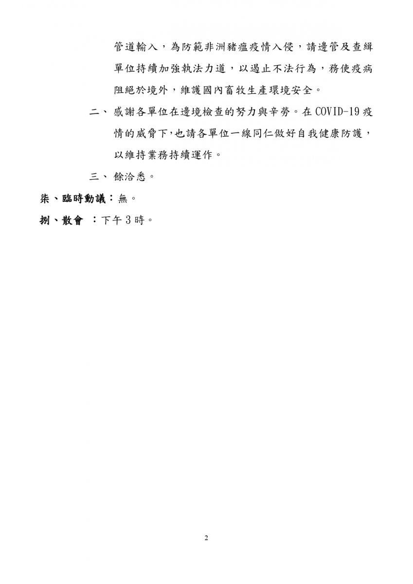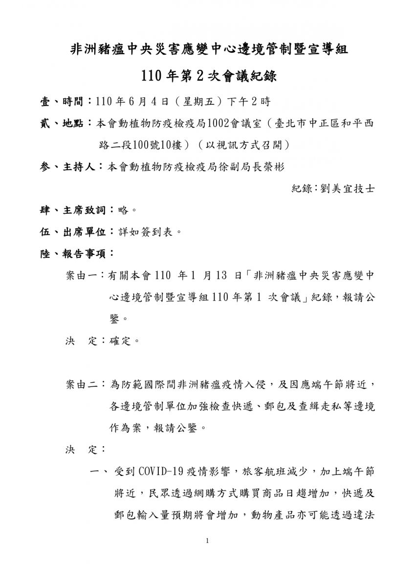 非洲豬瘟中央災害應變中心邊境管制暨宣導組110年第2次會議紀錄