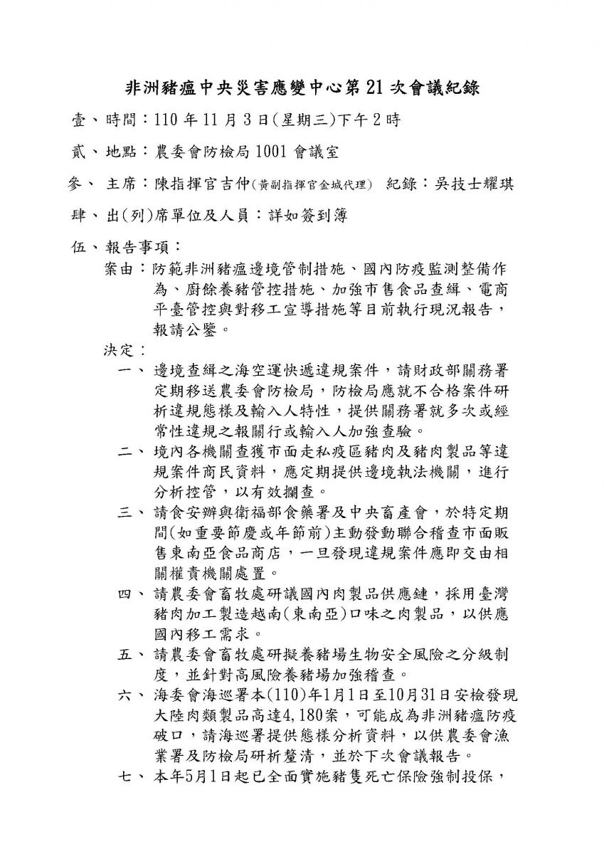 非洲豬瘟中央災害應變中心第21次會議紀錄(pdf)