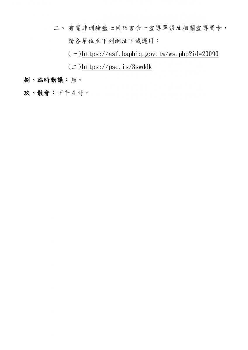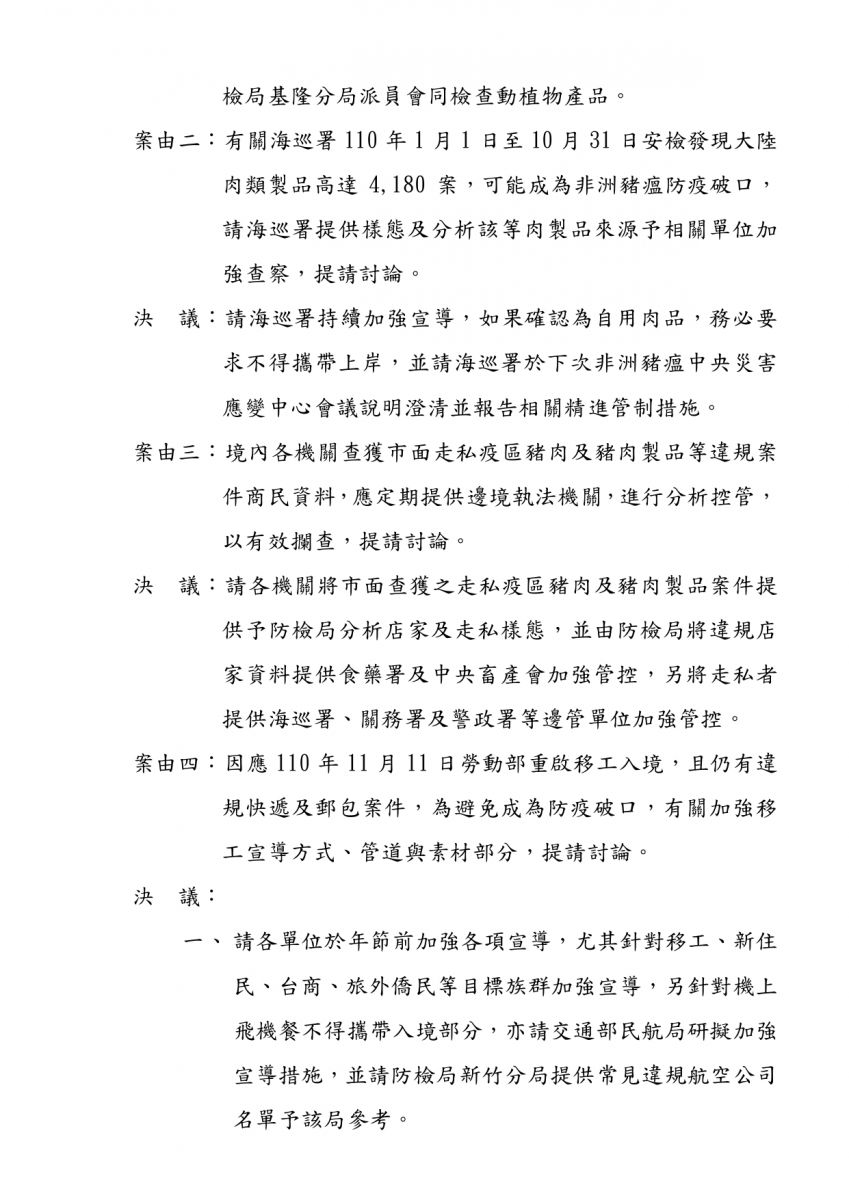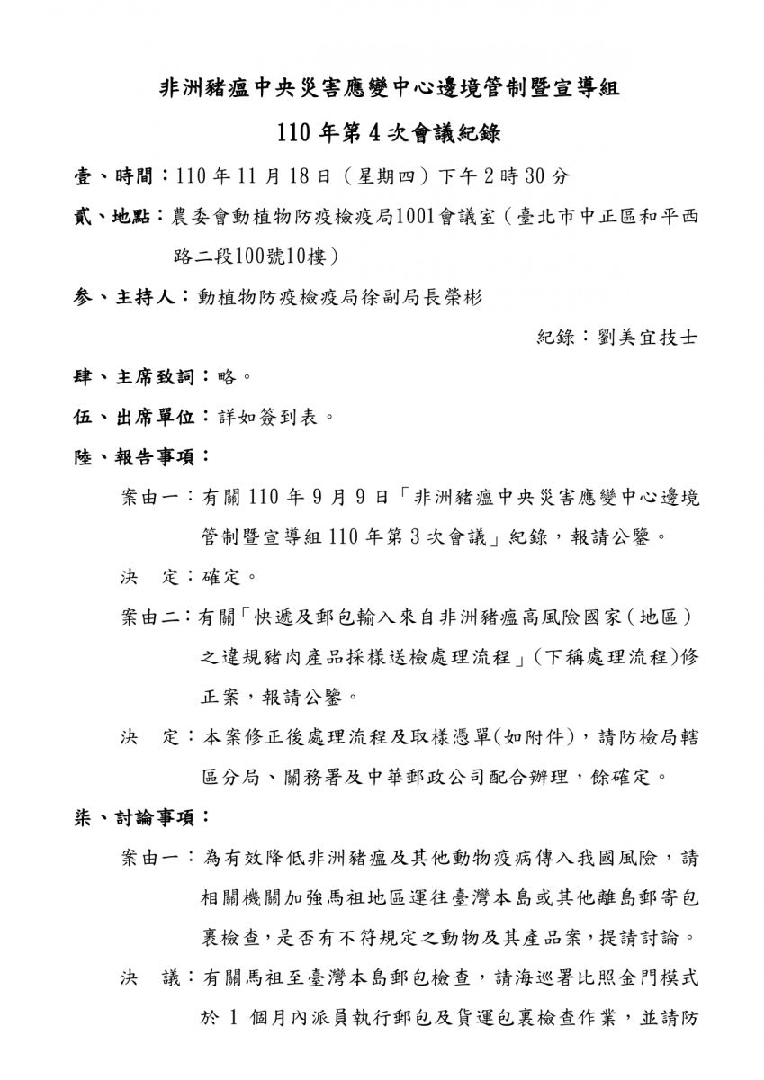 非洲豬瘟中央災害應變中心邊境管制暨宣導組110年第4次會議紀錄