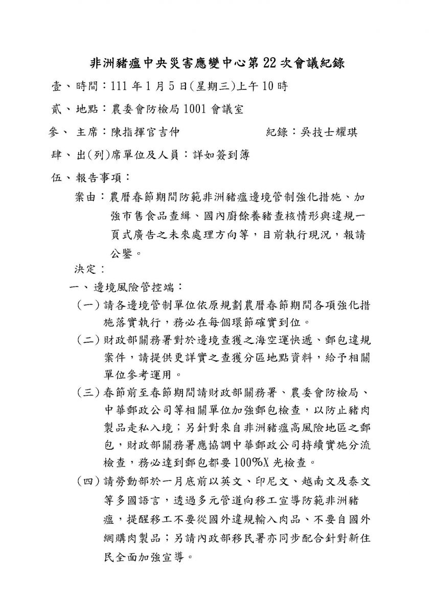 非洲豬瘟中央災害應變中心第 22次會議紀錄(pdf)