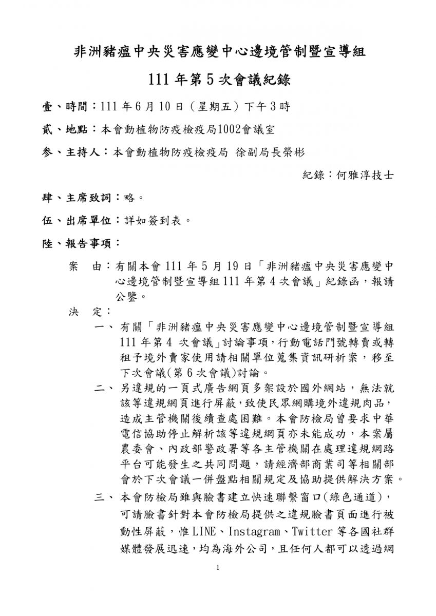 非洲豬瘟中央災害應變中心邊境管制暨宣導組111年第5次會議紀錄
