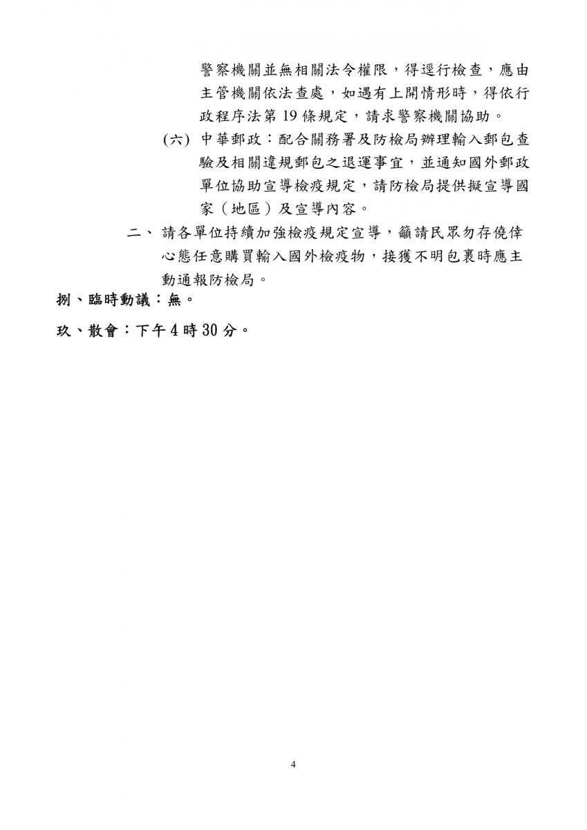 非洲豬瘟中央災害應變中心邊境管制暨宣導組110年第4次會議紀錄