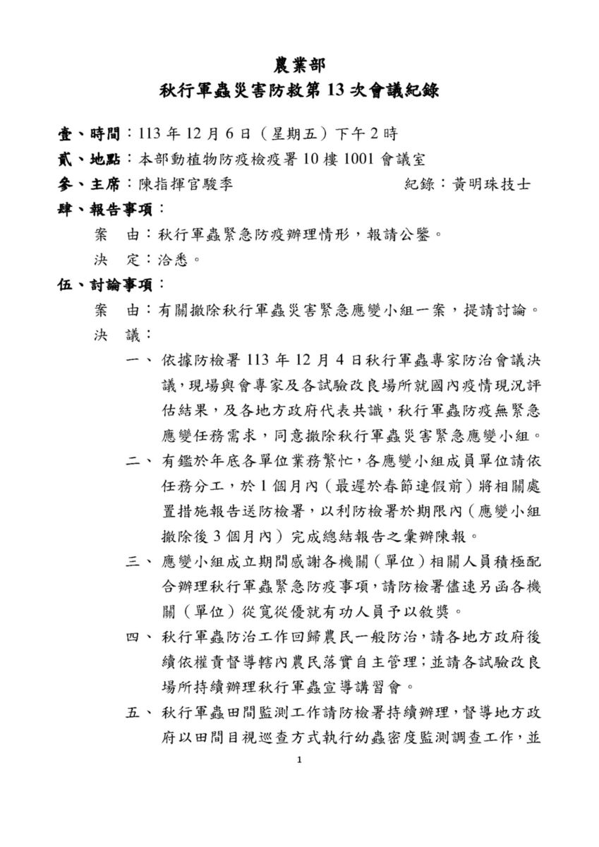 秋行軍蟲災害防救第13次會議紀錄